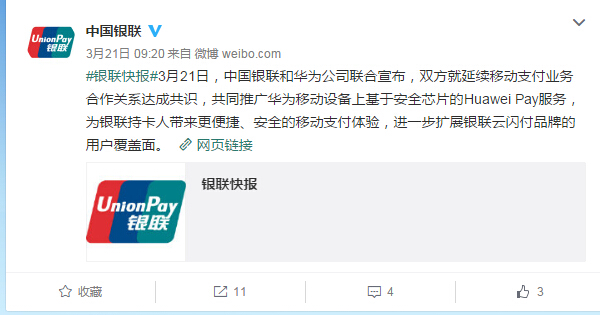 昨天,中國(guó)銀聯(lián)和華為公司聯(lián)合宣布,兩邊就連續(xù)移動(dòng)付出事務(wù)協(xié)作關(guān)系達(dá)成共識(shí),一起推行華為移動(dòng)設(shè)備上根據(jù)安全芯片的Huawei Pay效勞,為銀聯(lián)持卡人帶來(lái)更快捷、安全的移動(dòng)付出體會(huì),進(jìn)一步拓展銀聯(lián)云閃付品牌的用戶覆蓋面。